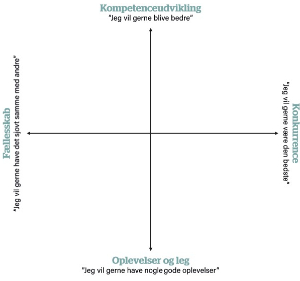 Denne deløvelse skal afdække løbernes generelle motivation for at dyrke orientering. Løberne får udleveret en stykke A4-papir med motivationsmodellen indtegnet (se model til højre). De får et par minutter til at sætte en lille markering på hver af de fire akser, i forhold til i hvor høj grad de motiveres af de forskellige faktorer for at dyrke orientering. Efterfølgende tegner de streger fra markering til markering, så der dannes en firkant, der skal illustrere deres motivationsprofil.