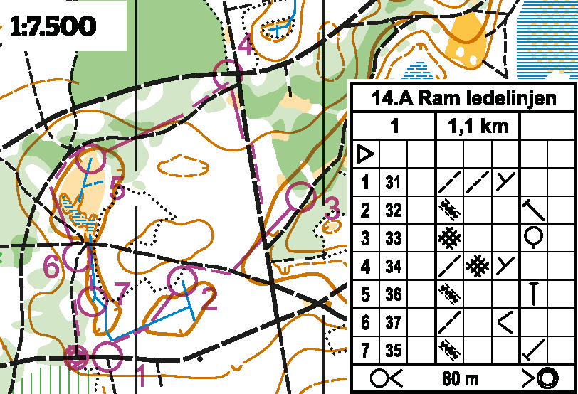 Lav korte baner (800-2000 meter), hvor der fra hver post med fordel kan laves et udløb igennem terræn mod en ledelinje. På kortet markeres den ledelinje, som der er meningen at løberne skal ramme i udløbet fra posten (på eksemplet her markeret med en stiplet linje). Sørg for at markeringen er tydelig.