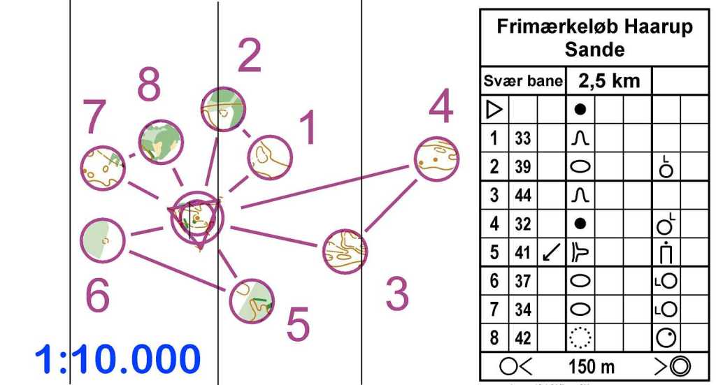 Der laves en kort bane, hvor store dele af kortet er maskeret, undtagen i flere små områder (frimærker), og banen går fra frimærke til frimærke. Det gøres i condes ved at vælge ’Masker kort’ i menuen ’Canvas’, og efterfølgende lave frimærkerne med ’tilføj udskæring’ i værktøjslinjen. Husk at genskabe meridian-linjerne, da løberne skal bruge dem.