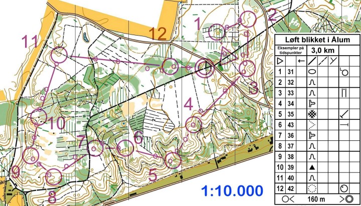 Der laves en almindelig orienteringsbane i varieret terræn med kuperede områder (se eksempel til højre). I starten af banen bør der bruges områder, hvor der er god sigt og højdeforskelle, så løberne kan fornemme, hvor meget information om terrænet de kan få ved at løfte blikket. Senere på banen kan der varieres mellem både åben og tættere skov, samt forskellig kupering, så løberne kan lære, at det er vigtigere at løfte blikket på nogle tidspunkter end andre. Lav gerne et kort visende trænerens forslag til tidspunkter, hvor det vurderes gunstigt at løfte blikket, så løberne kan sammenligne og lade sig inspirere (se eksempel til højre).