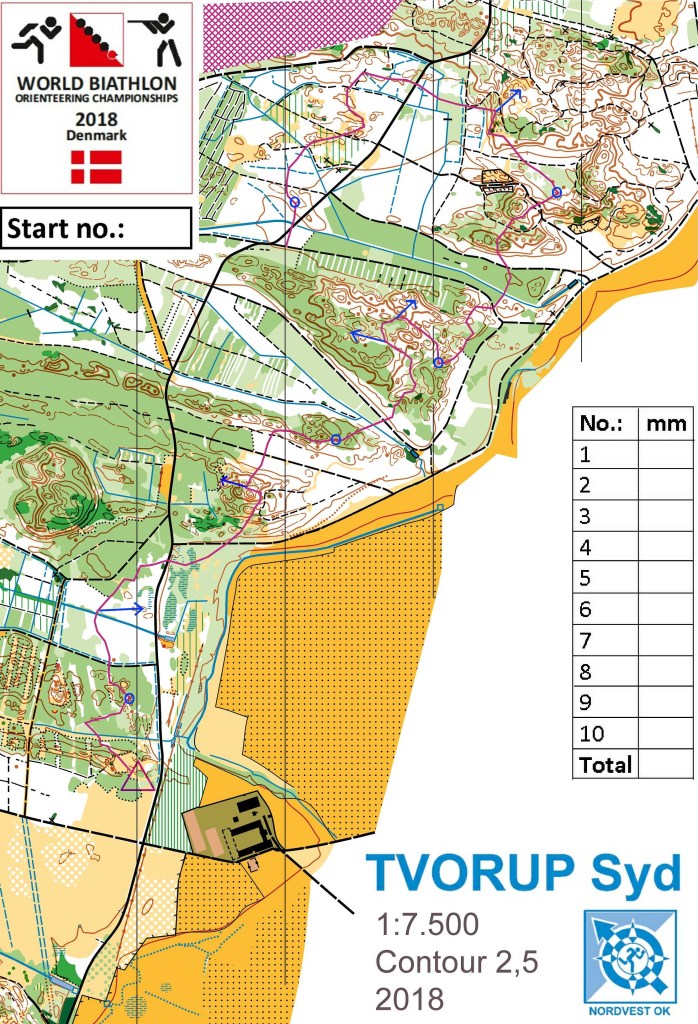 Foliebelagt kort med starttrekant markeret. Mønsterkort med rute og poster markeret. Postskærme samt forskelligfarvede plastikstrimler fastgjort på en klemme og klemmerne fastgjort til en tøjsnor, som udsætteren kan have over skulderen.