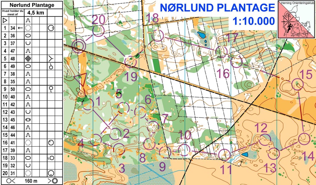 I eksemplet på en bane i Nørlund Plantage er baneforløbet lagt i tre forskellige terræntyper, idet løberne fra start til post 11 vil holde mest af lysninger og utydelige kurvedetaljer, fra post 11 – 16 vil holde mest af moser, tætheder og enligstående træer og fra post 16 – mål vil holde mest af tætheder og kurvedetaljer.