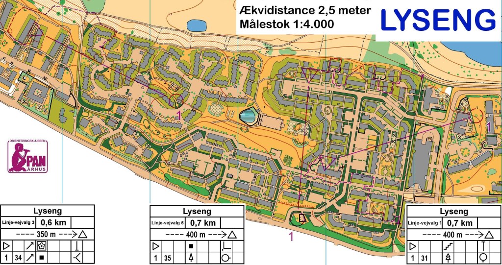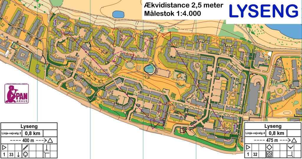 I eksemplet i Lyseng er der lavet fem baner – to på hvert kort. Hver bane starter med en linje, som er lavet i Condes ved at dobbeltklikke på starttrekanten, og sætte flueben ved Rute fra tidsstart.