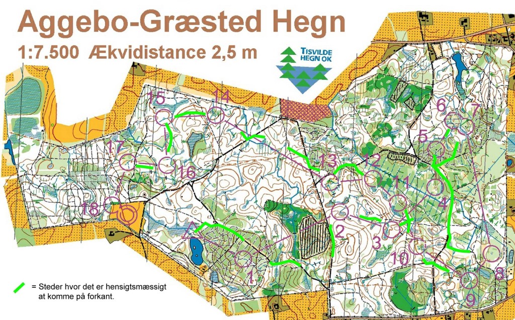 I eksemplet er øvelsen lavet på et kort fra DM Mellem i Aggebo-Grædsted Hegn, og de steder, hvor det er vurderet hensigtsmæssigt at komme på forkant, er markeret med grønne streger.